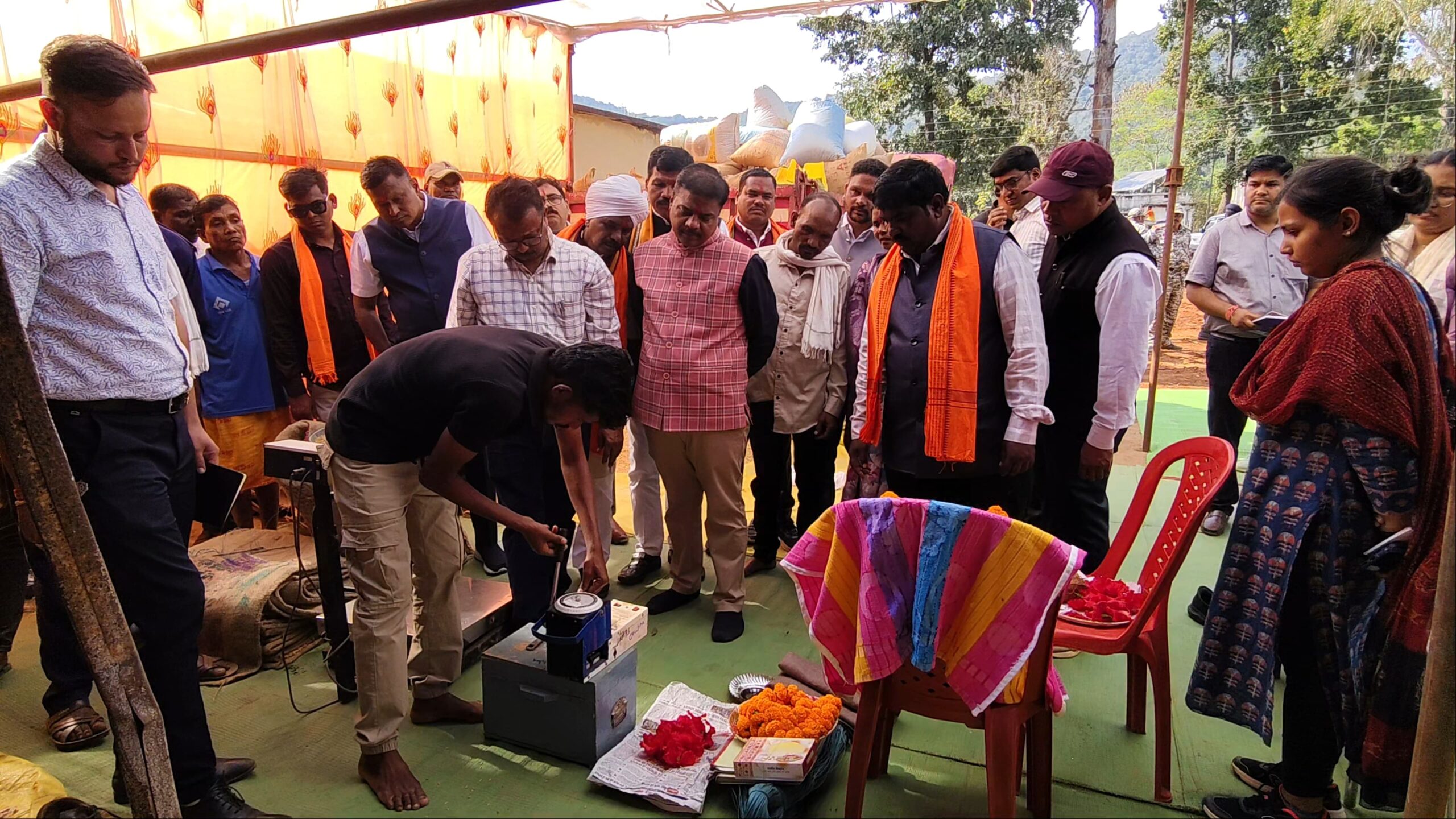 प्रवास के दौरान मंत्री कश्यप धान खरीदी केंद्र, ओरछा पहुँचे, जहाँ उन्होंने—